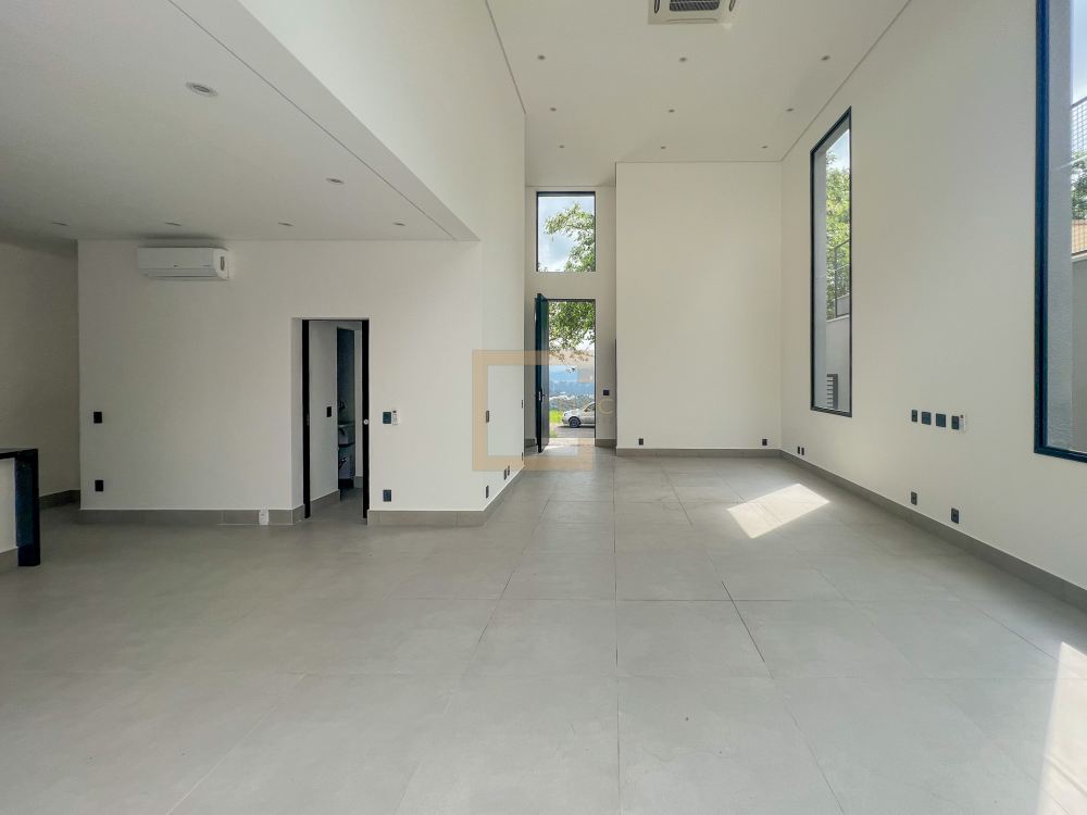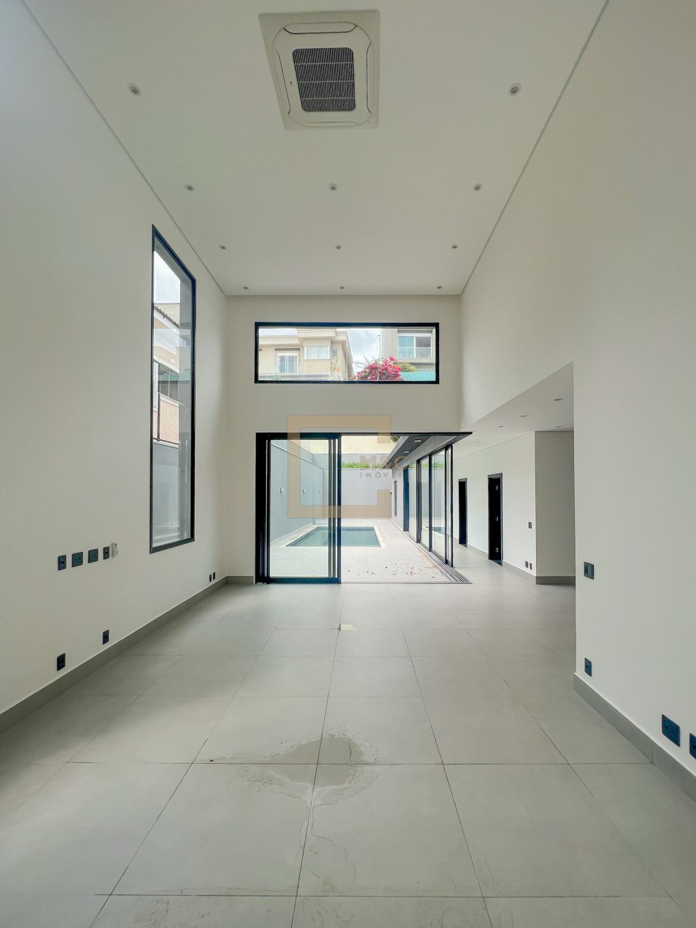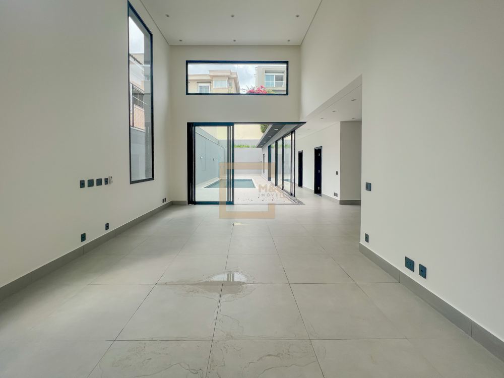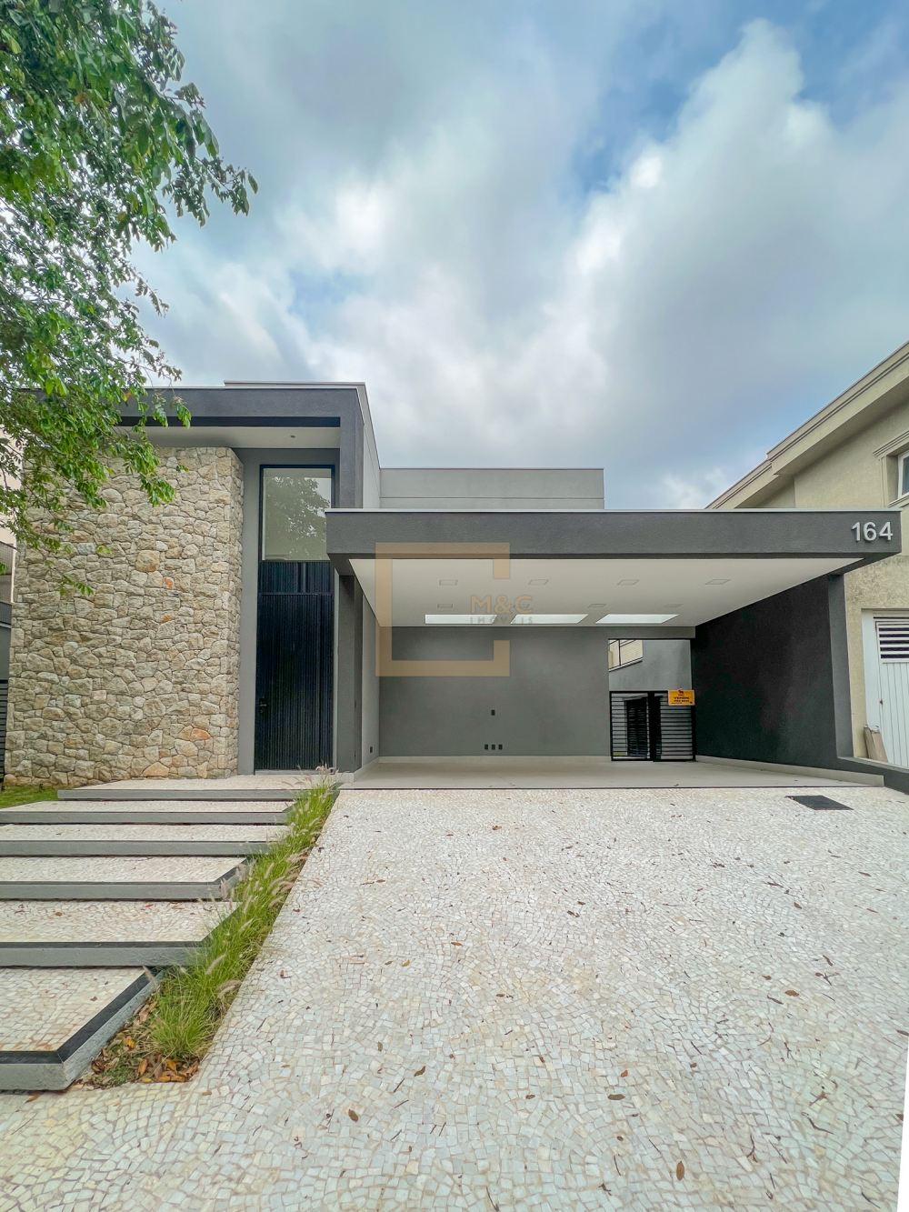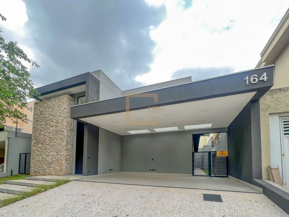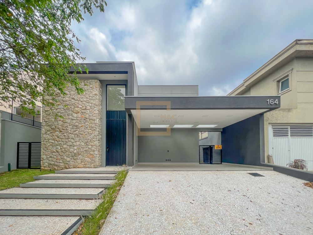 Nova residência térrea, localizada em um condomínio de excelência, construída com materiais de alto padrão, apresentando um design contemporâneo e uma distribuição interna muito eficiente.