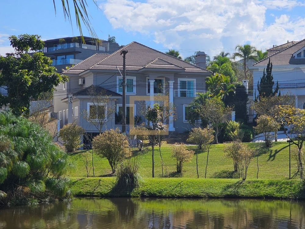 Nesta residência, desfrutamos de uma bela vista para o lago, com uma fachada imponente e janelas que trazem iluminação natural para os espaços amplos.