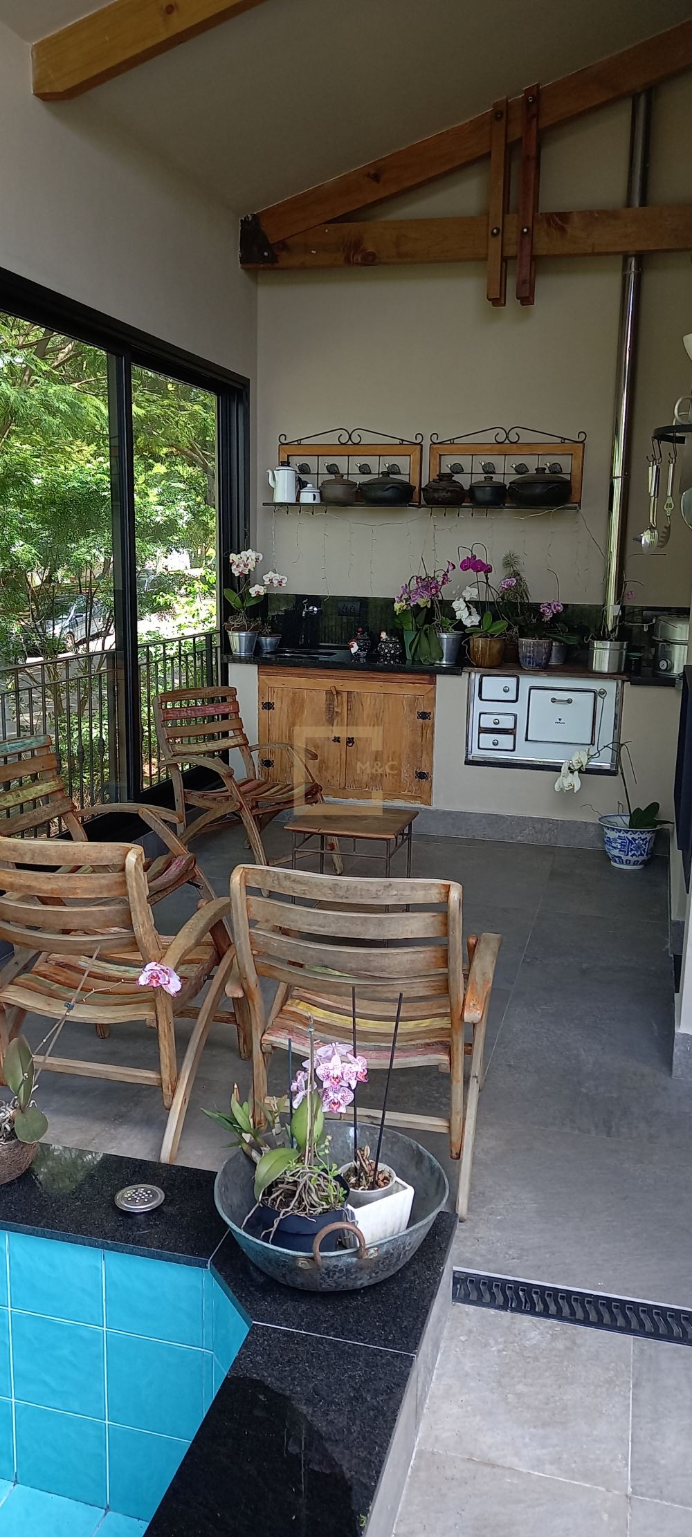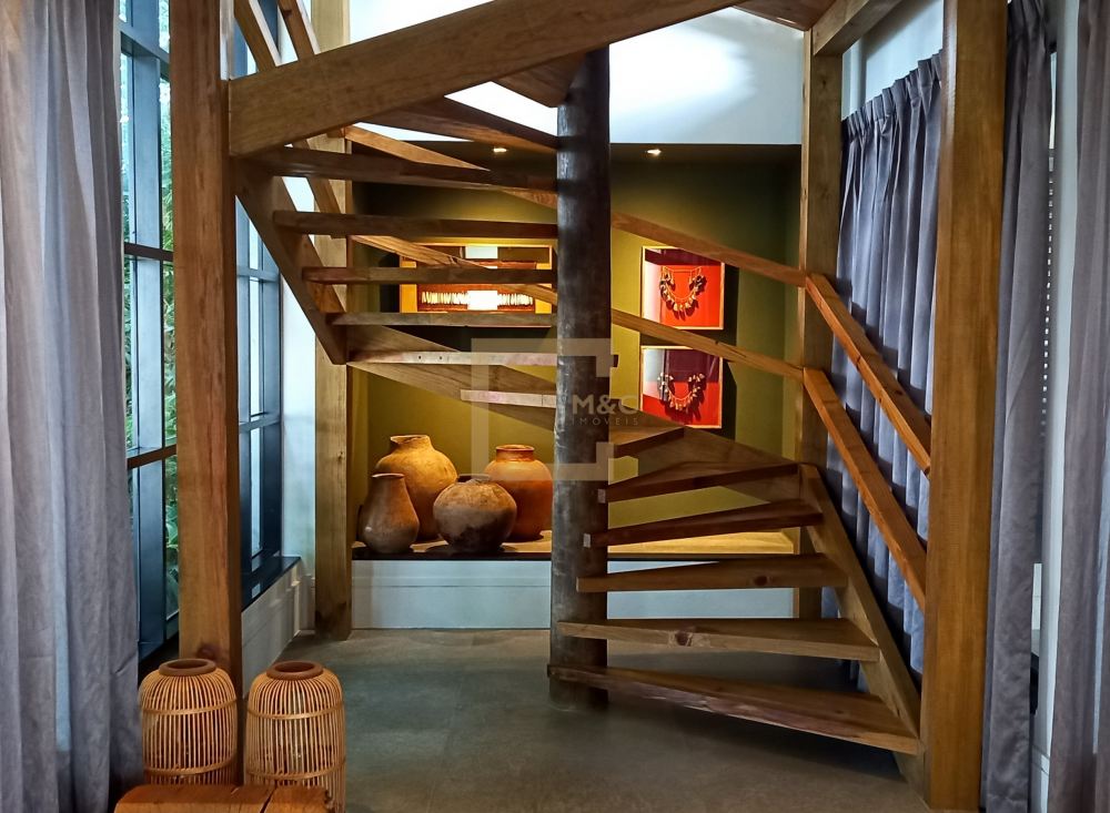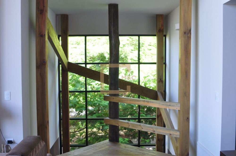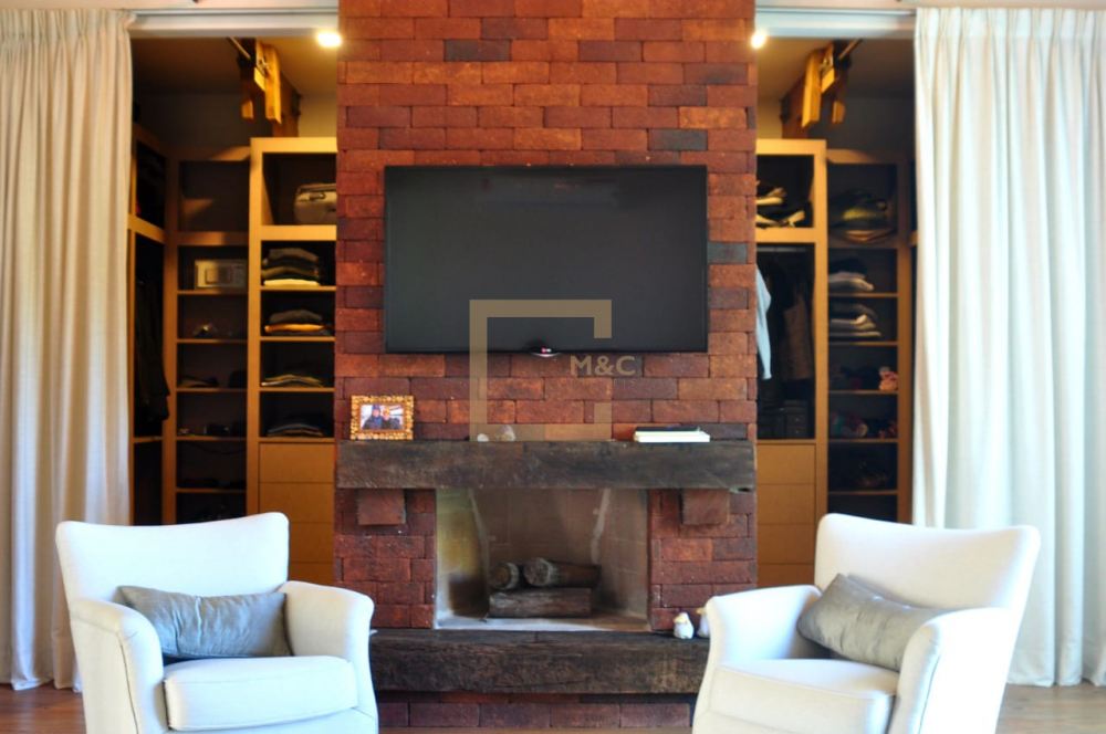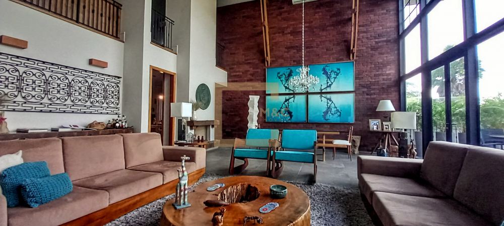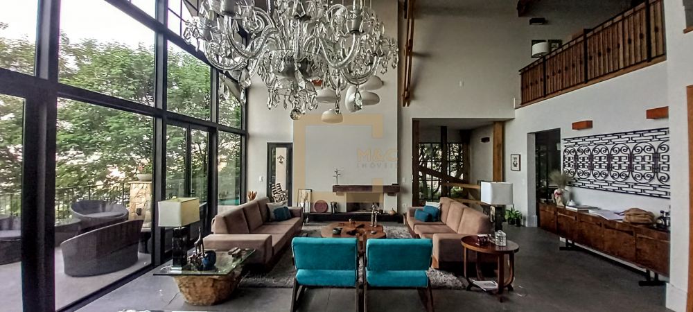 * Living com 2 lareiras, pé direito 6 m a 8.5 m com tesouras em madeira e aço, fachada e portas de vidro para o terraço, Sala de tv.