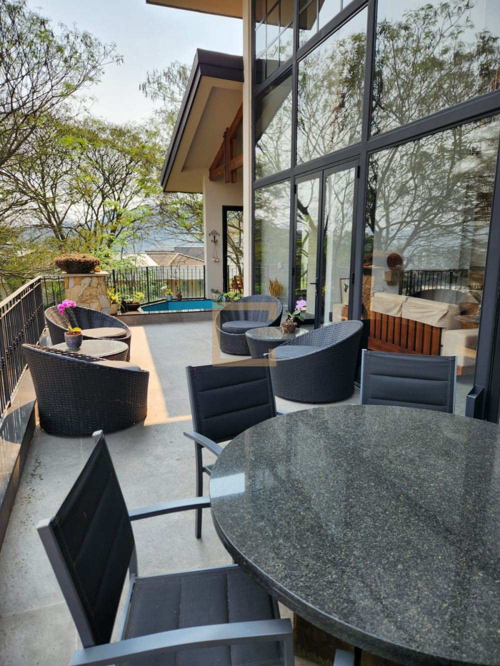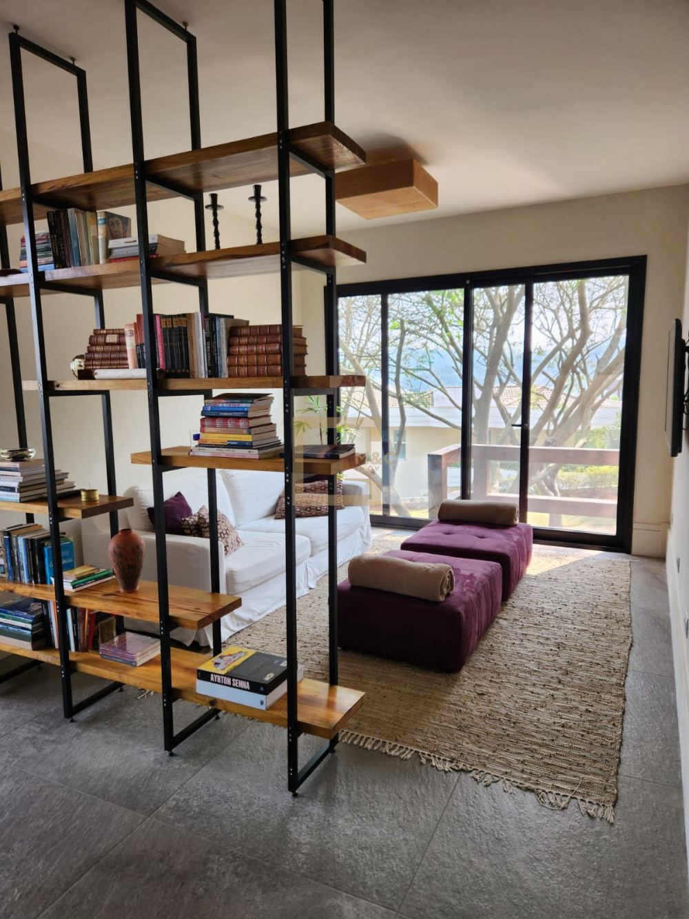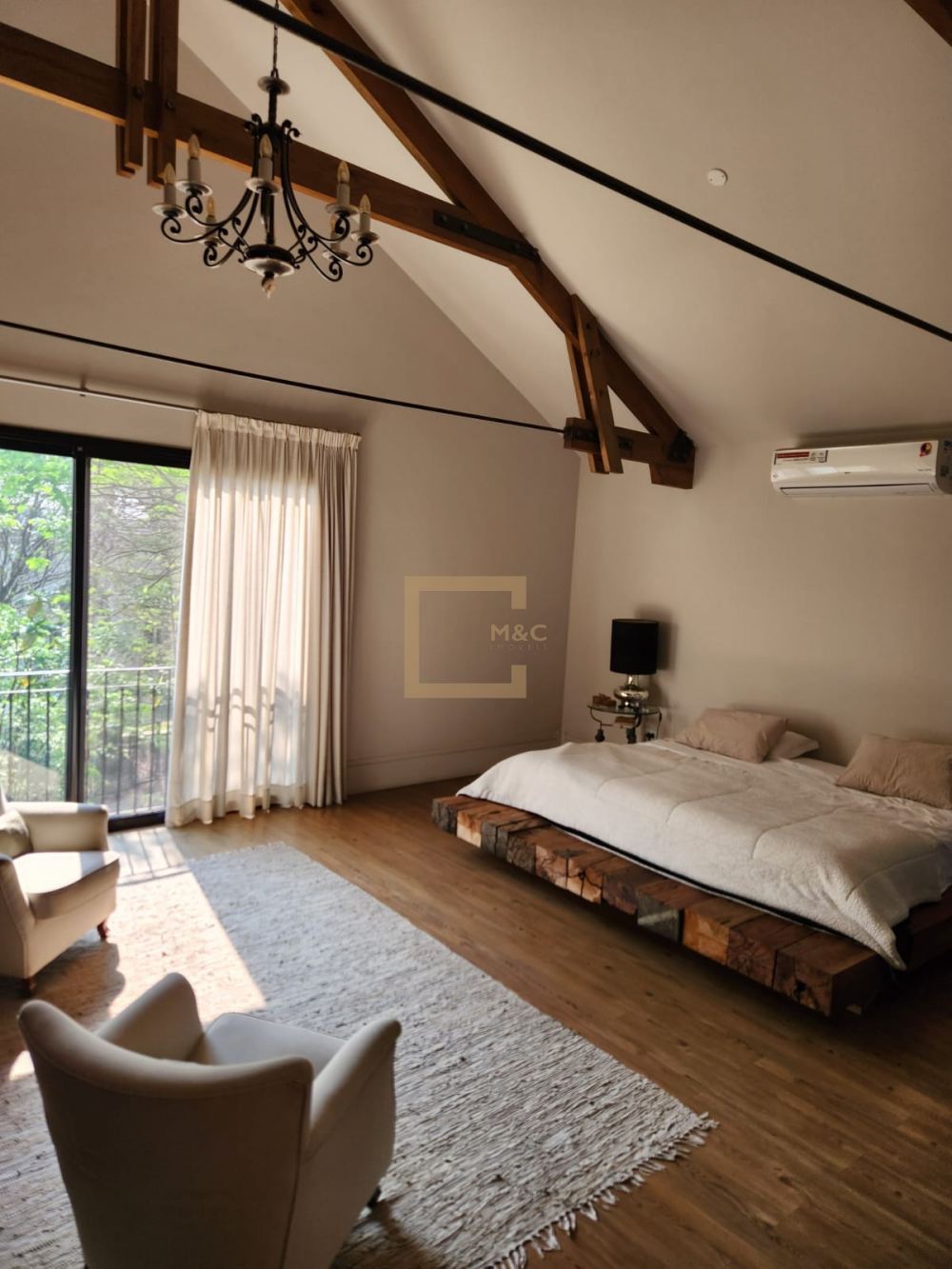 * Living com 2 lareiras, pé direito 6 m a 8.5 m com tesouras em madeira e aço, fachada e portas de vidro para o terraço, Sala de tv.