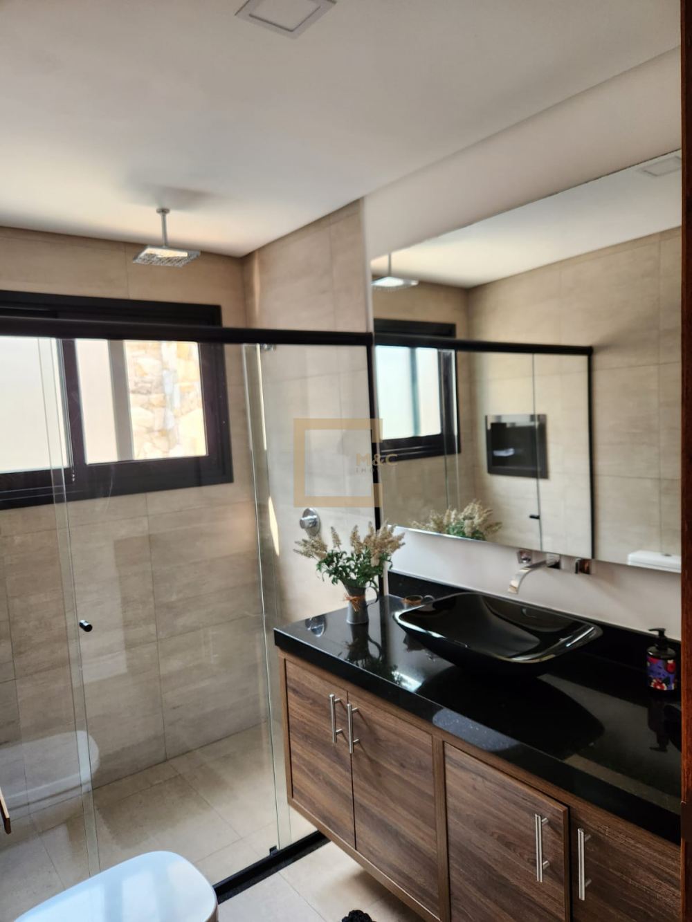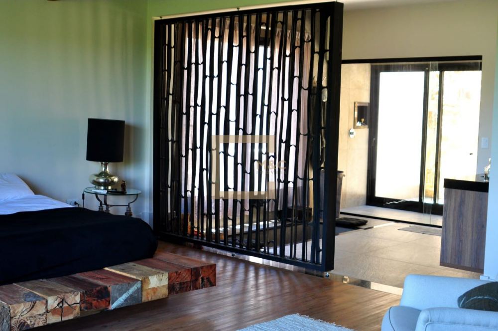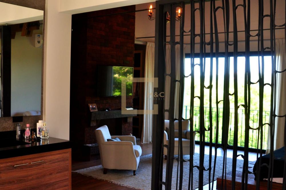 Ampla suíte casal com closet e lareira. Banheiro integrado com jardim de inverno e banheira.