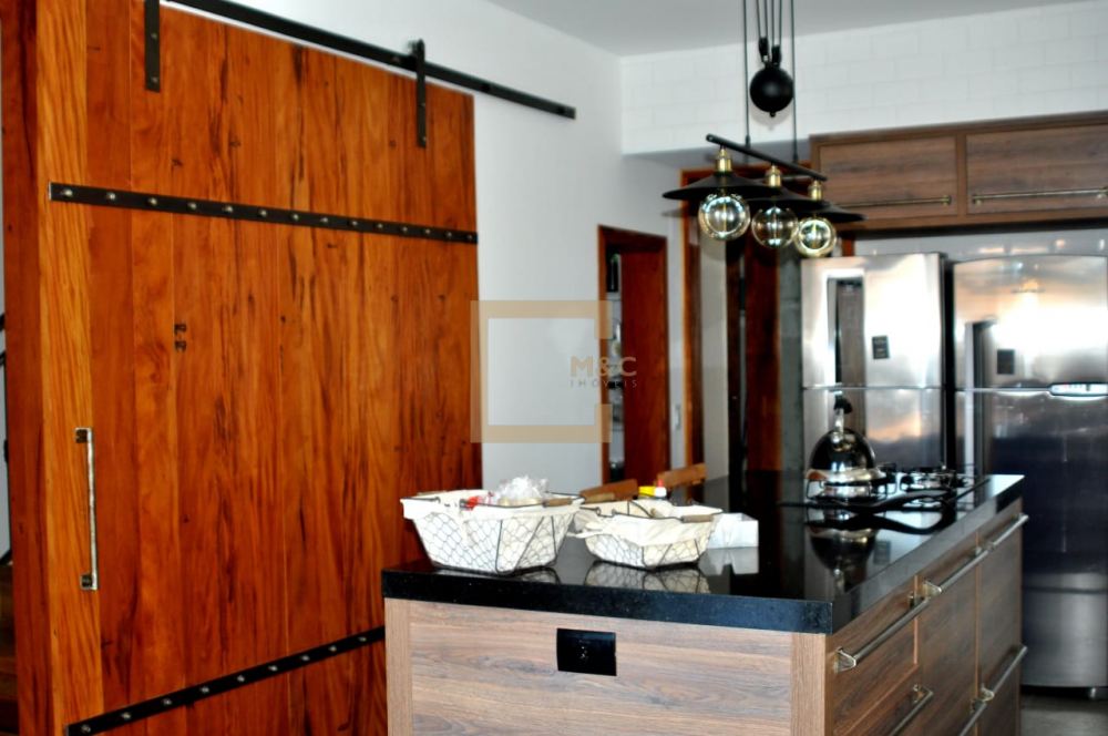 Cozinha com ilha central, armários e despensa integrada.
