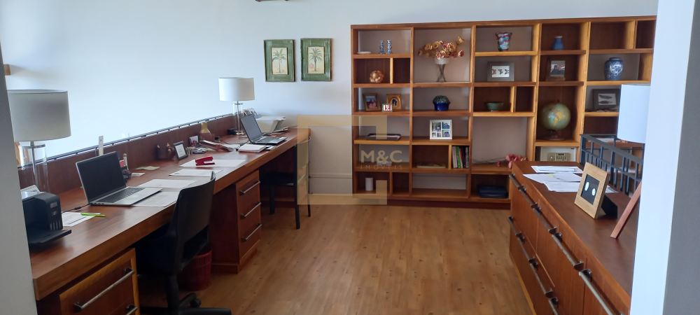 Escritório com bancada em madeira para 2 pessoas, sala tv e sala de lareira.